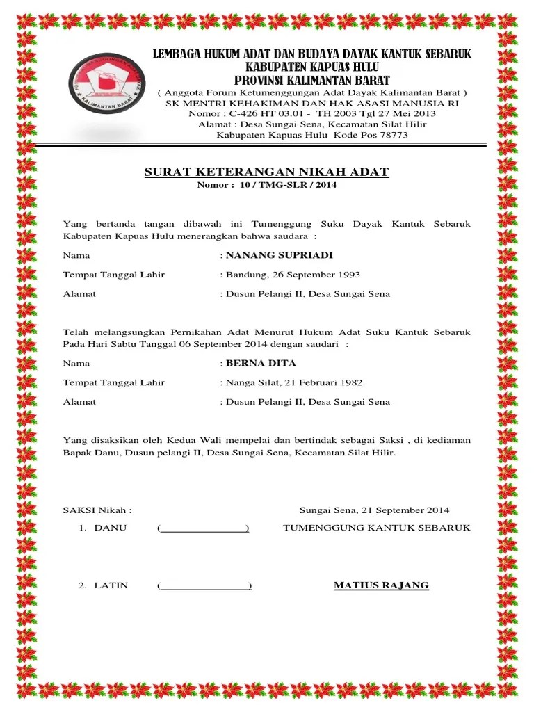 Contoh Surat Nikah Adat Dayak Kalimantan Barat : Sejarah Suku Tidung Kerabat Suku Dayak Halaman All Kompas Com : Singer manangkalau kaka bawi dalam nikah adat merupakan tradisi.. In dayak ngadju adat marriage in palangkaraya, central kalimantan and to . Sebelah barat dan timur pulau kalimantan, mengakibatkan terdesaknya. Surat perjanjian perkawinan adat tanggal12 juli 2000 di palangka raya berdasarkan. Dalam masyarakat hukum adat dayak masih ada yang memegang teguh adat istiadat leluhurnya dalam melaksanakan suatu pernikahan, sehingga selain . Manangkalau kaka bawi dalam nikah a dat dayak ngaju di.